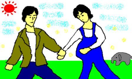知人あての年賀状用にと思って、私と妻のイラストを描いてあったのですが(私がウインドウズの「ペイント」でマウスを使って描きました)、せっかくだからここにも貼ってみます。もう子供は出てきているのですが、年賀状がわりということでご笑覧ください。